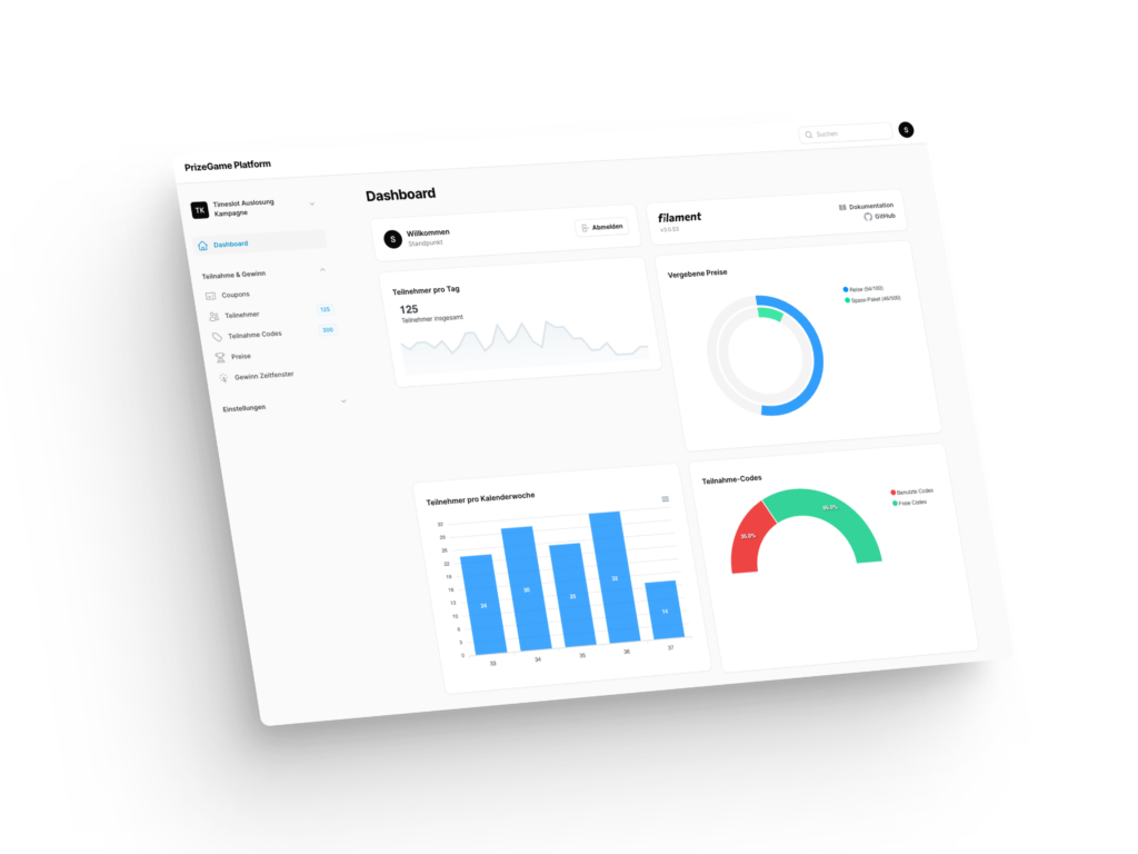 Behalte alle wichtigen KPIs im Blick und manage deine Kampagnen mit Leichtigkeit. Überwache die Anzahl der Teilnehmer, verfolge, wie viele Preise noch offen sind, und analysiere den Verlauf der Teilnahmen in Echtzeit. Das Dashboard zeigt dir genau, welche Mechaniken am besten funktionieren und wo Optimierungspotenziale liegen. So kannst du Kampagnen effizient steuern und den Erfolg direkt messen.