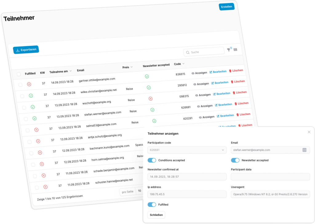 Das integrierte Fulfillment-Tool bietet dir eine transparente Übersicht über alle Teilnehmer und deren Gewinne. Hier siehst du auf einen Blick, welche Preise bereits versendet wurden und welche noch offen sind. Die übersichtliche Teilnehmerverwaltung erleichtert zudem die direkte Kommunikation und ermöglicht eine effiziente Abwicklung deiner Kampagne.