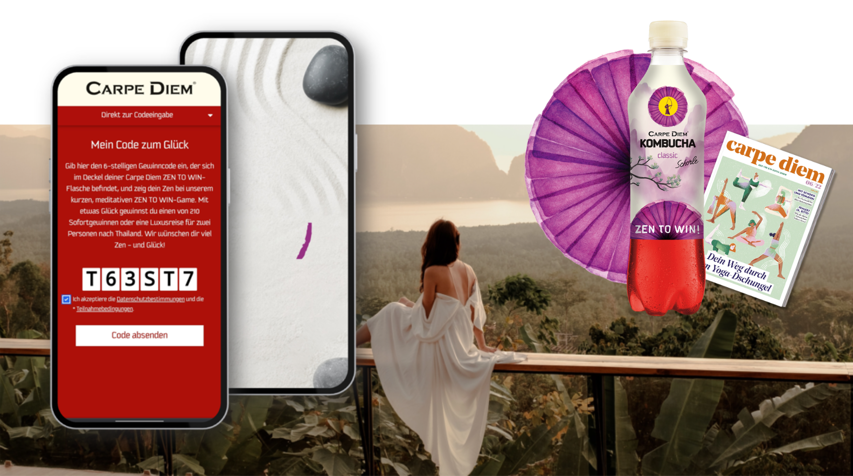 Die Teilnehmer konnten einen von 210 Sofortgewinnen gewinnen, darunter Tasting-Pakete, Zen-Pakete und Magazin-Kurz-Abos. Alle Teilnehmer nahmen zusätzlich an einer Hauptverlosung teil, bei der ein Luxus-Urlaub in Thailand verlost wurde. Als Trostpreis erhielt jeder eine digitale Leseprobe des „Carpe Diem“-Magazins, um die User Experience positiv abzurunden.